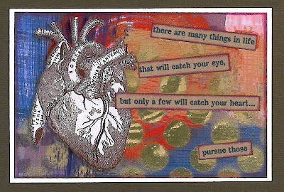 I decided in the end to go with a fairly simple design - just one image and a line or two of text - so as not to cover up too much of that busy busy backgroundI used this heart image from The Graphics Fairy, and had fun researching a lot of different heart-related quotes to go with it, so each postcard could be unique.